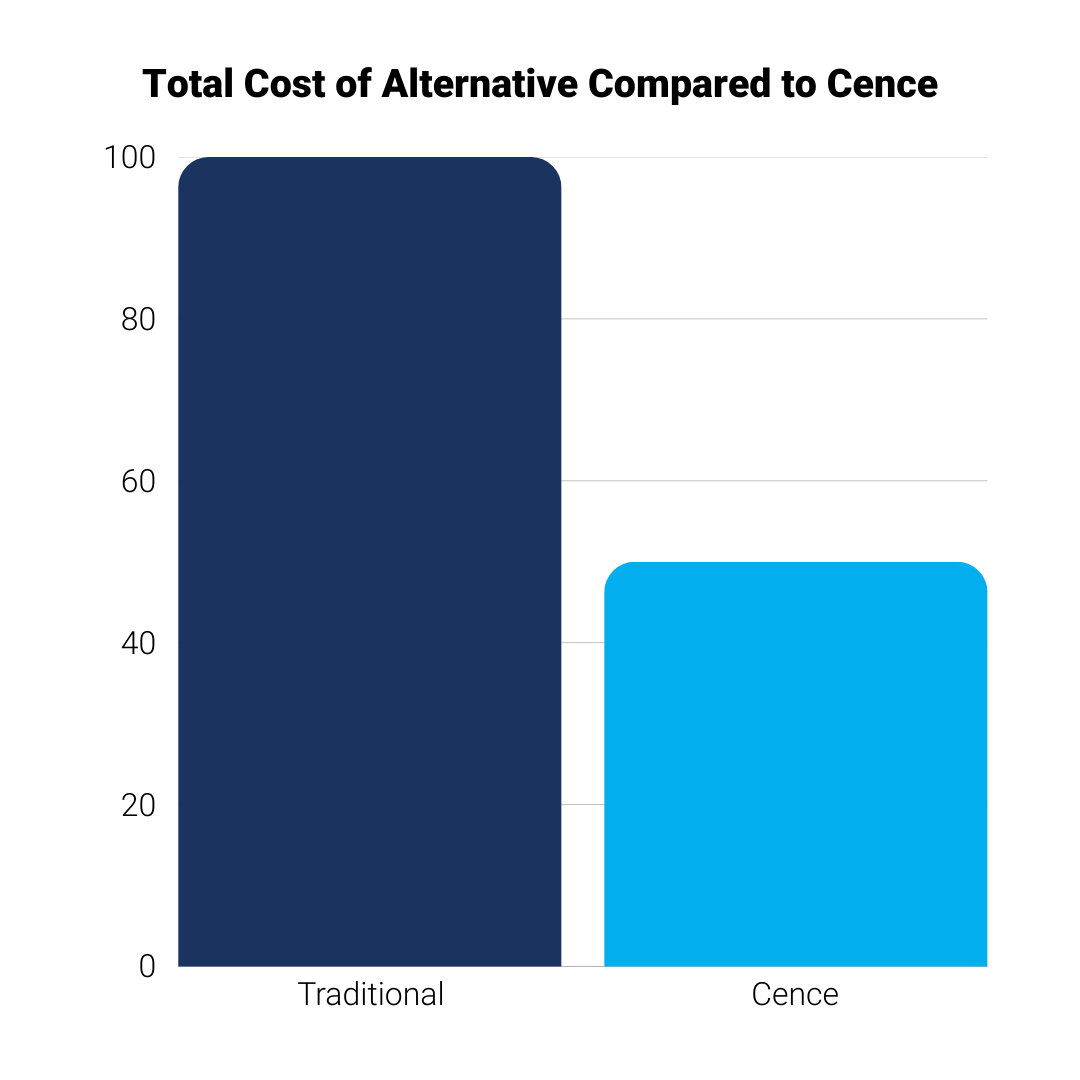 Cence low-voltage DC power distribution system removes the need for conduit. LED fixtures don’t last as long as they are advertised owing to the driver dying prematurely. Contractors work faster with lighter infrastructure, and reduced material footprint contributing to both cost savings and lower embodied carbon.